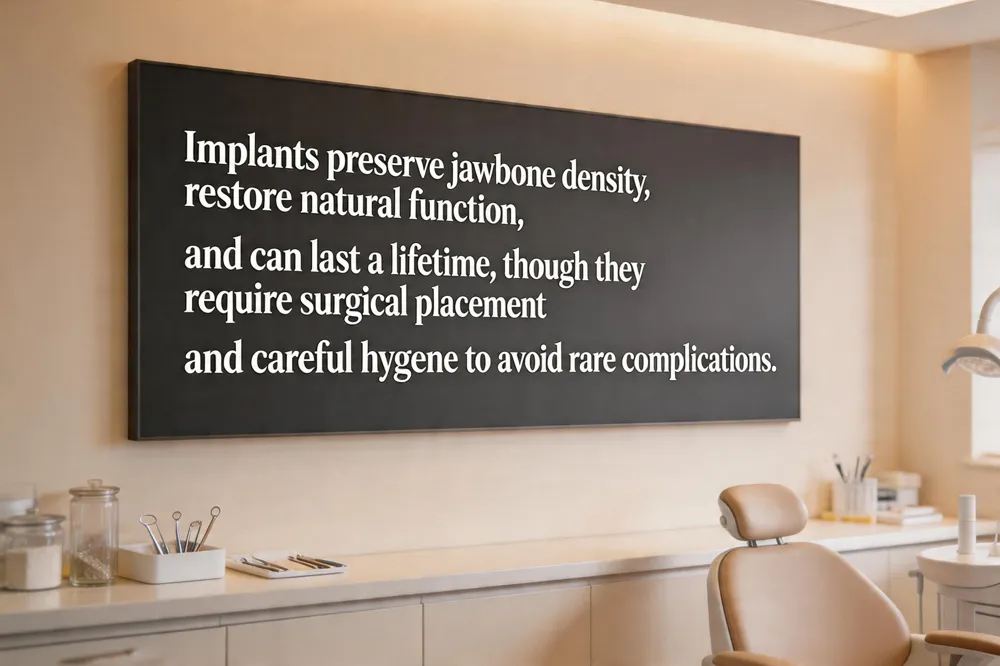 Long‑term side effects – Peri‑implantitis, gum recession, persistent nerve irritation, and, in rare cases, metal allergy can arise over years, emphasizing the need for diligent oral hygiene and regular check‑ups.